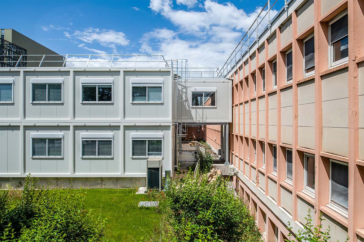 L’extension est reliée au bâtiment existant par une passerelle modulaire posée sur un portique, garantissant une circulation fluide entre les deux bâtiments.