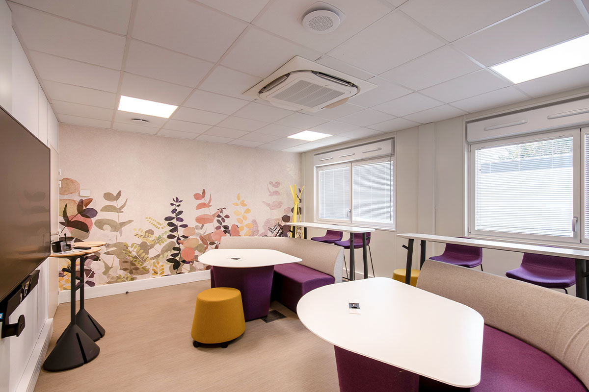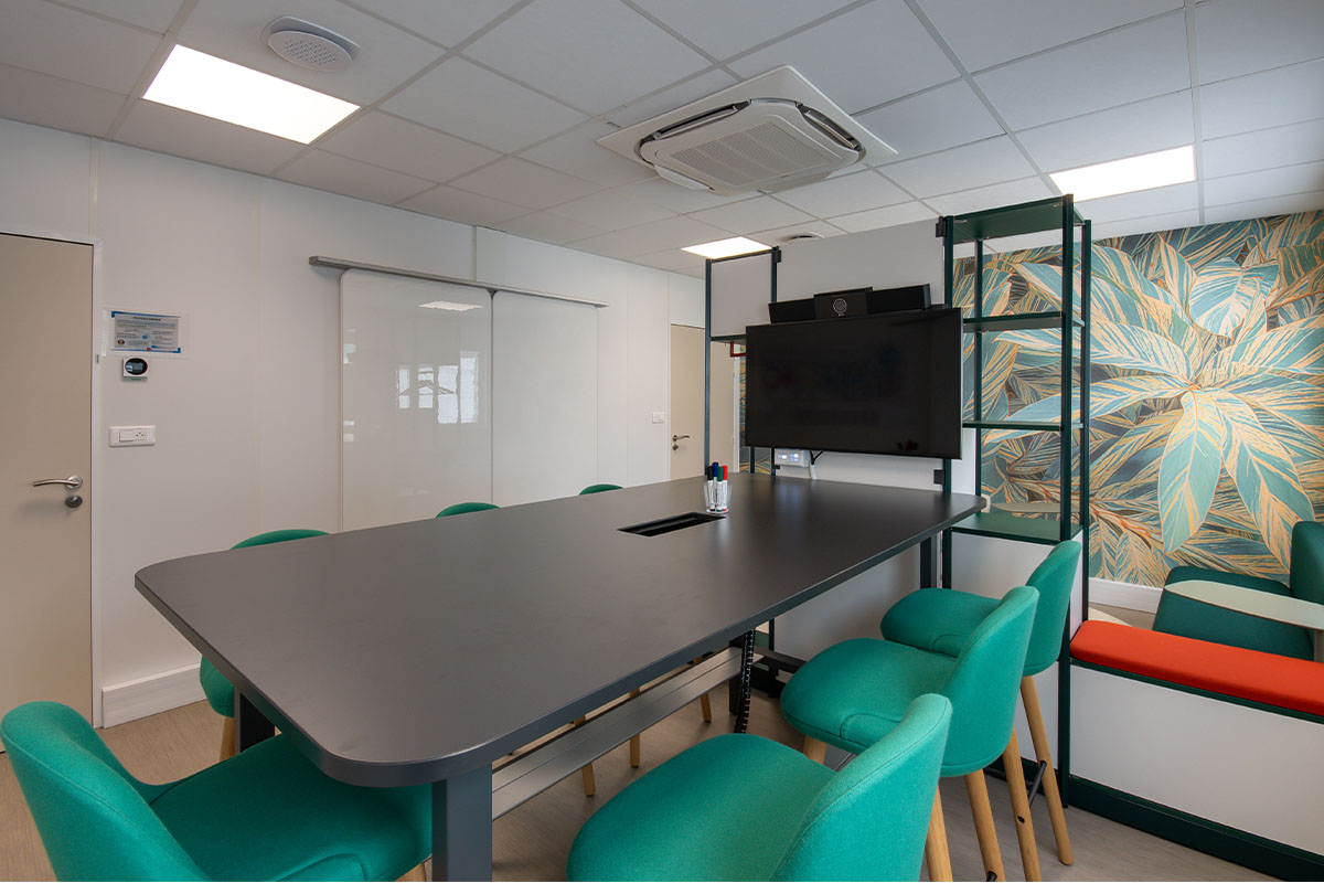 D’une surface de 324 m², ce bâtiment comprend 3 bureaux et 7 salles de réunion, répartis sur deux niveaux. L’extension a été conçue pour garantir un cadre de travail confortable, alliant flexibilité d’utilisation, performance acoustique et luminosité optimale. La capacité d’accueil est d’environ cinquante personnes.