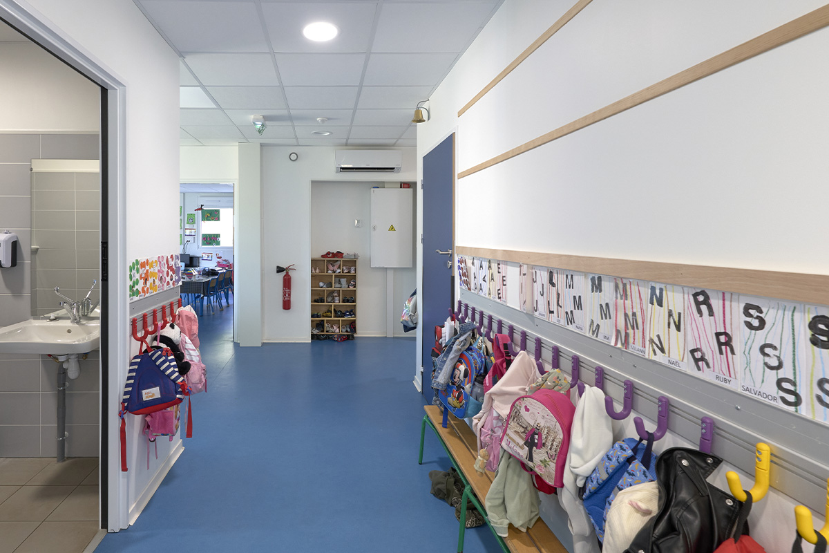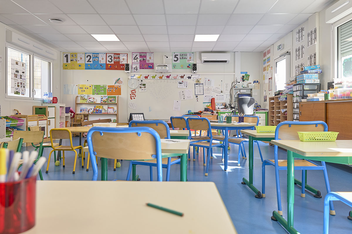 L’extension comprend trois salles de classe de 55 m², chacune équipée d’un point d’eau, d’une réserve pour le matériel pédagogique, de murs aimantés et d’un accès direct vers l’extérieur.